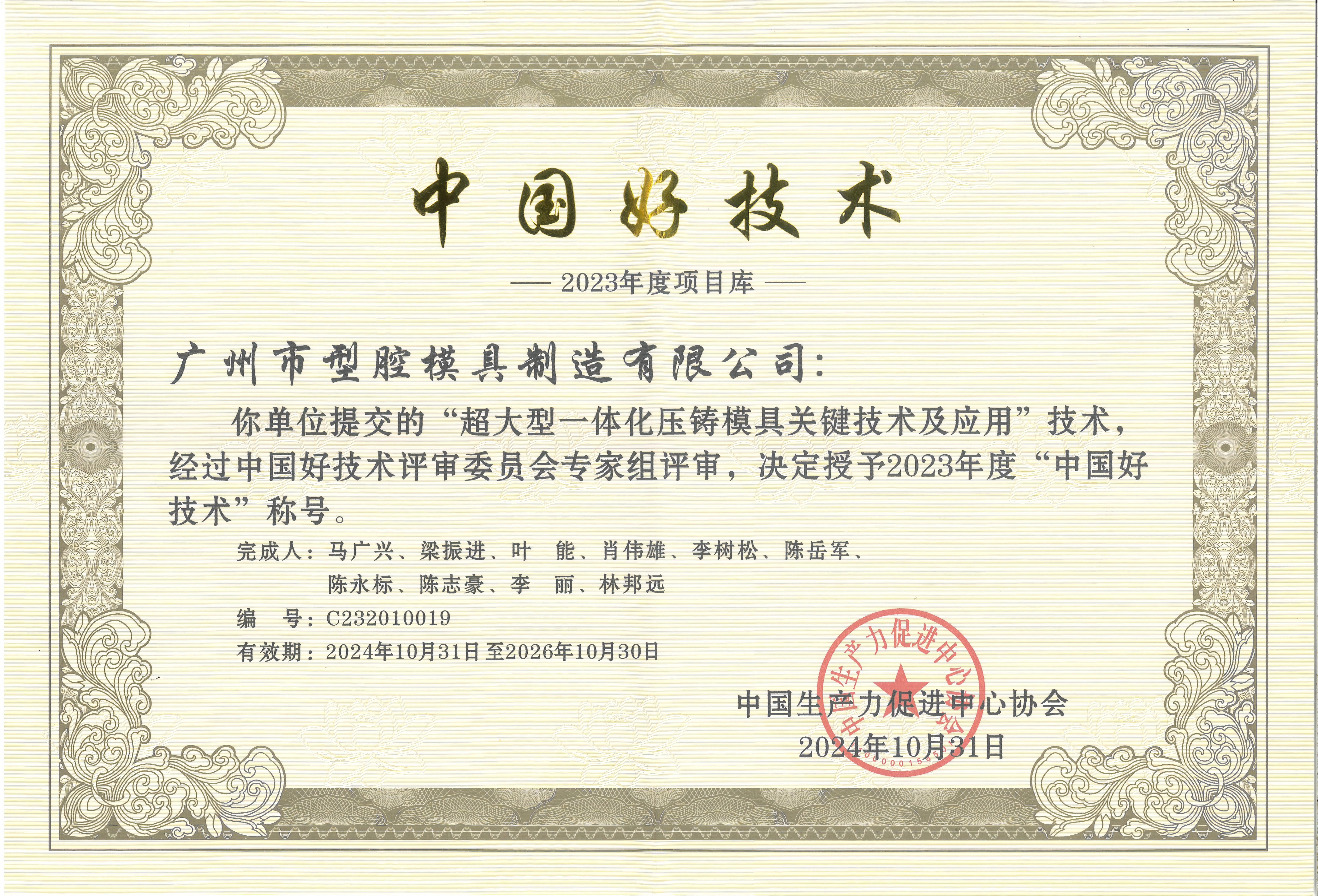 近日,由中國生產力促進中心協會主辦的“中國好技術”大會暨2023年度“中國好技術”稱號授予儀式在北京圓滿舉辦。中國生產力促進中心協會理事長申長江宣讀了2023年度“中國好技術”稱號授予決定。經嚴格評審,廣型科技的“超大件一體化壓鑄模具關鍵技術及應用”項目入選2023年度“中國好技術”項目庫,并榮獲“中國好技術”稱號。
